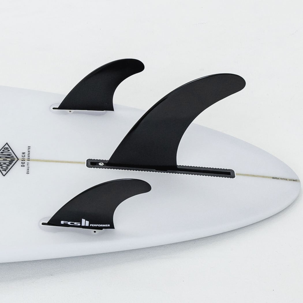 フィンボックスは2+1でサイドフィンはFCSII仕様。スタビライザーのフィンを付けて2+1が基本ですが、シングルフィンや大きめのツインフィンでも楽しめます。