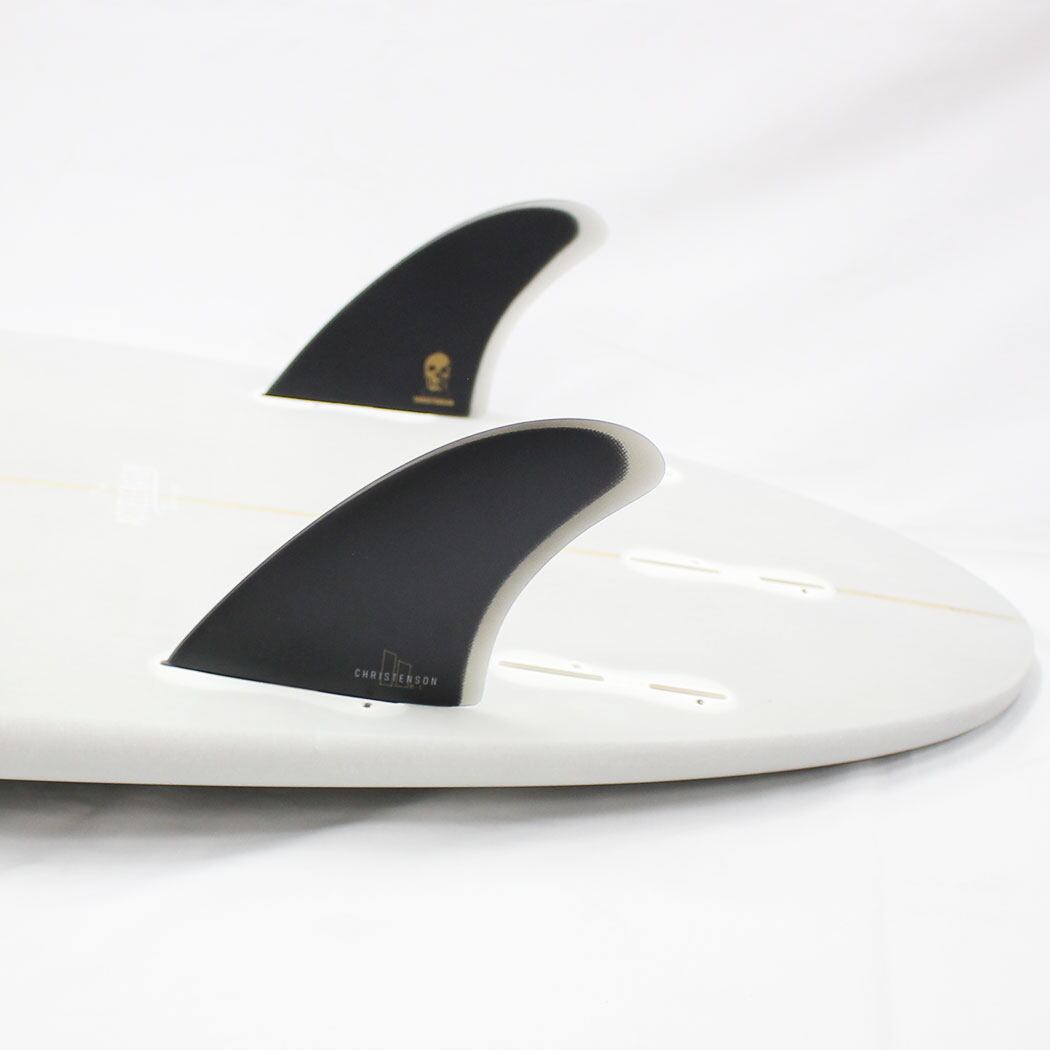ツインフィンは、センターフィンがないため水の抵抗が少なく、スピードが出しやすいのが特徴です。特に、クリステンソンツインのテンプレートは、ベース幅が広く、レイク(後方への傾斜)が効いているため、パワフルでドライブの効いたターンが可能になります。