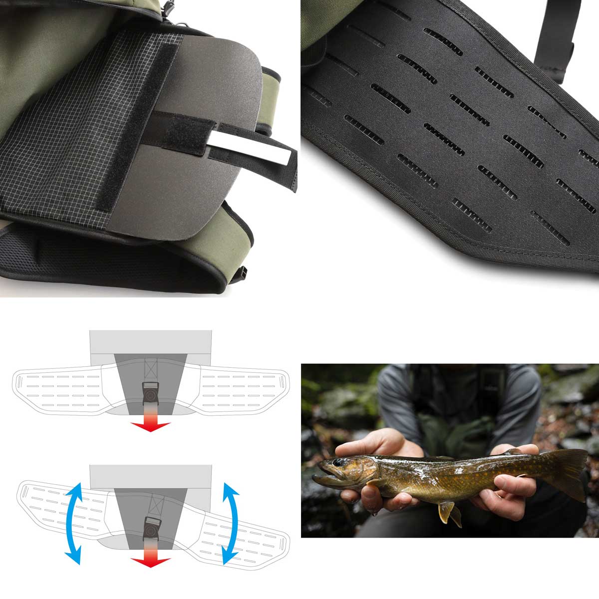 登山用バックパックに採用されるPIVOTシステムを搭載。荷重を常にウエストベルト中央に載せ保ち、歩行や登はん時の動きやすい背負い心地を実現。肩への負担を軽減し、長時間キャストしても疲れにくい設計です。MOLLEシステム対応のスロットには、各種ポーチ類やオプションを装着可能。ウエストベルトは取り外し、交換ができるます。