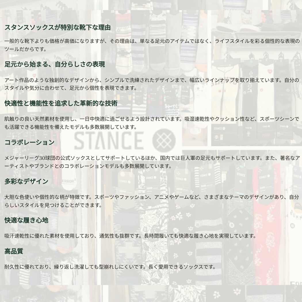 スタンスのメンズモデルには、さまざまなデザインと機能性が備わっています。例えば、耐久性に優れた素材を使用し、深いヒールポケットと伸縮性のあるアーチサポートが特徴です。これにより、足にぴったりとフィットし、快適な履き心地、